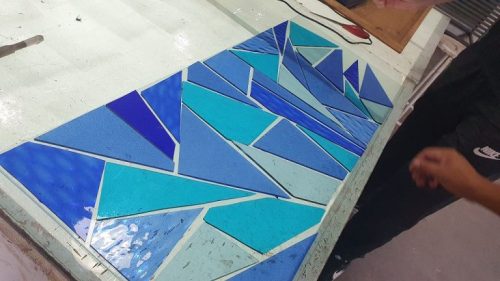 Produzido na técnica de liga flexível, as diversas formas geométricas em vários tons de azul são aplicadas em cima de uma base de vidro transparente, seguindo o desenho do projeto. A finalização é feita com uma liga especial e uma proteção de vidro extra que garante e durabilidade ao vitral. Leia mais sobre a técnica de liga flexível